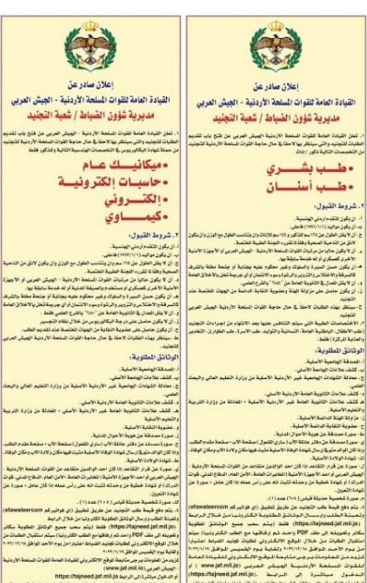 : أعلنت القيادة العامة للقوات المسلحة الأردنية – الجيش العربي عن فتح باب تقديم الطلبات للتجنيد في تخصصات الطب البشري وطب الأسنان وميكانيك عام وحاسبات إلكترونية وإلكتروني وكيماوي.