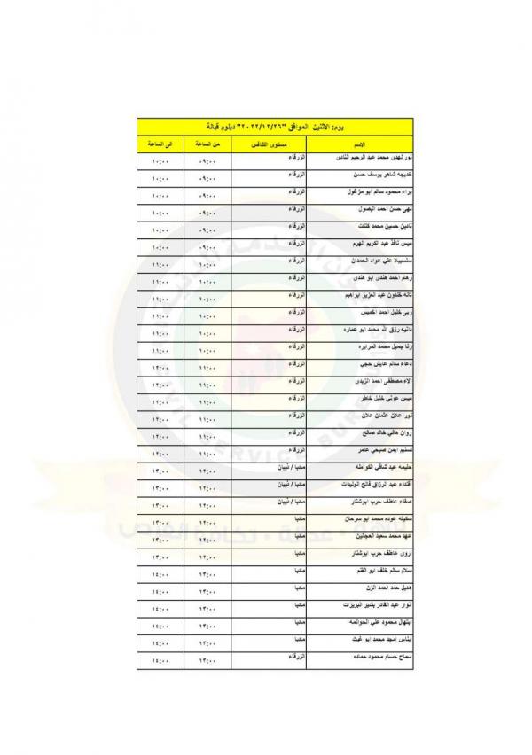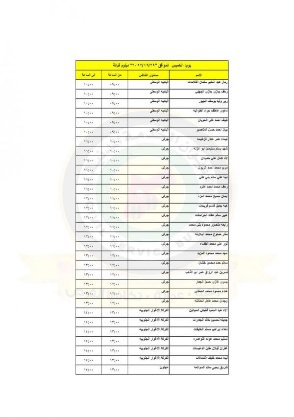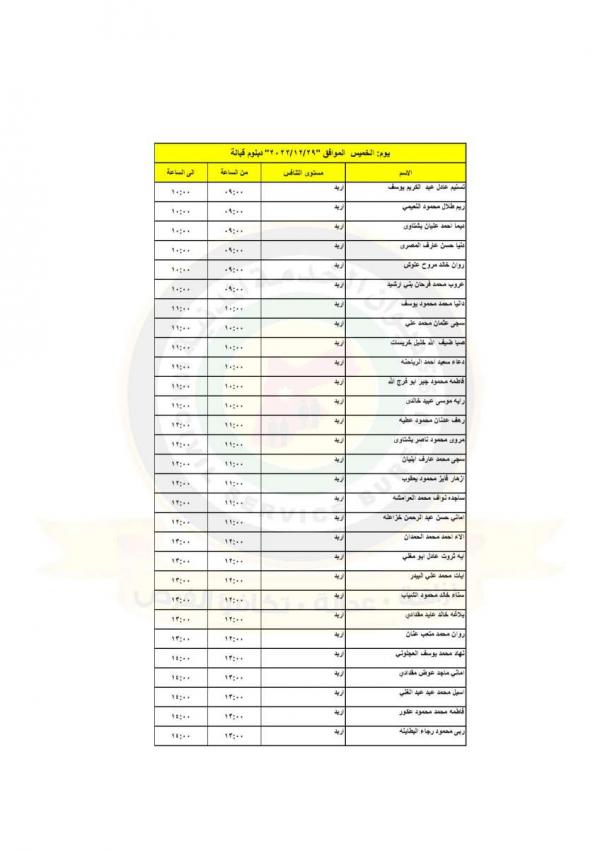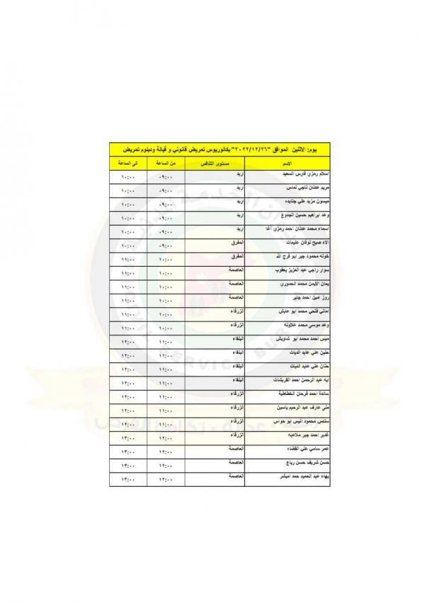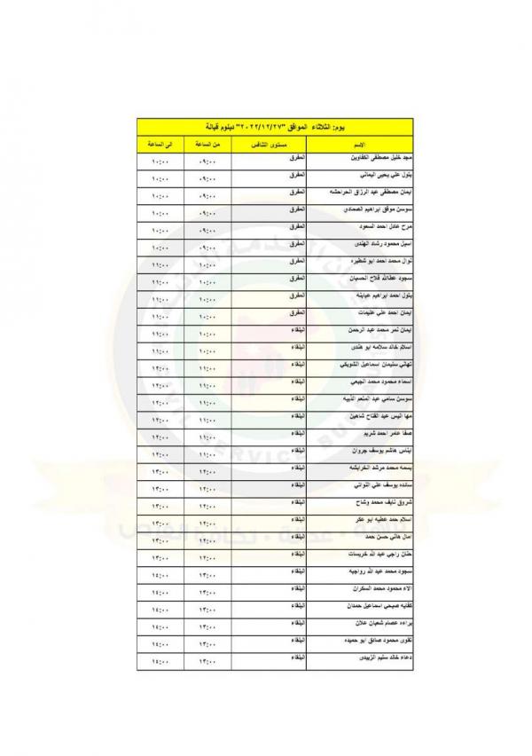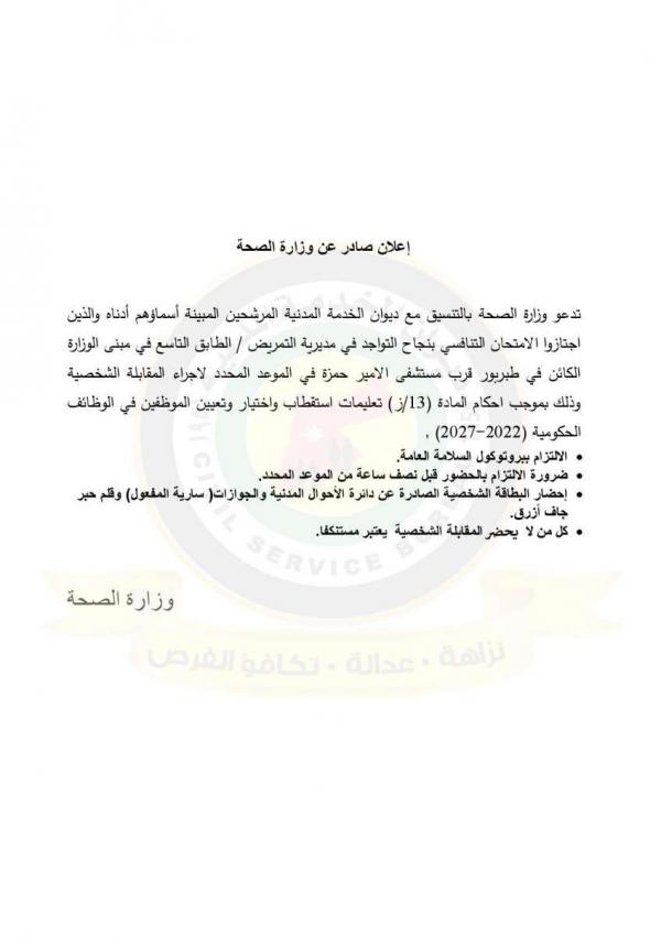 : دعت وزارة الصحة بالتنسيق مع ديوان الخدمة المدنية التالية اسماؤهم إلى التواجد في مديرية الموارد البشرية لاجراء المقابلات الشخصية لغايات استكمال التعيين.