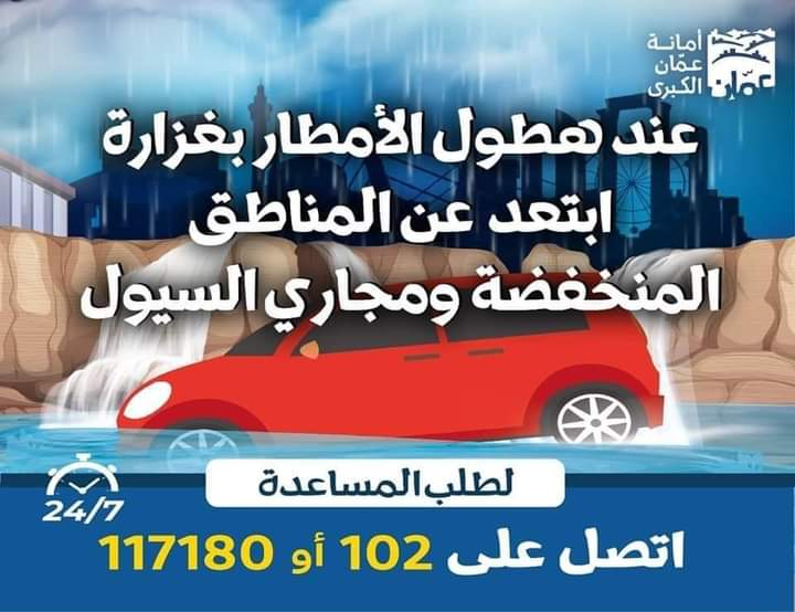 تعلن أمانة عمان حالة لطوارئ المتوسطة ، اعتباراً من صباح يوم غداً ، وذلك للتعامل مع الحالة الجوية المتوقعة وفقاً لنشرات دائرة الأرصاد الجوية.