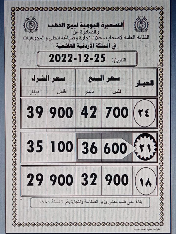 وبلغ سعر بيع غرام الذهب عيار 21 الأكثر رغبة من الأردنيين بالسوق المحلية عند 36,60 دينارا لغايات شراء المواطنين من محلات الصاغة.
