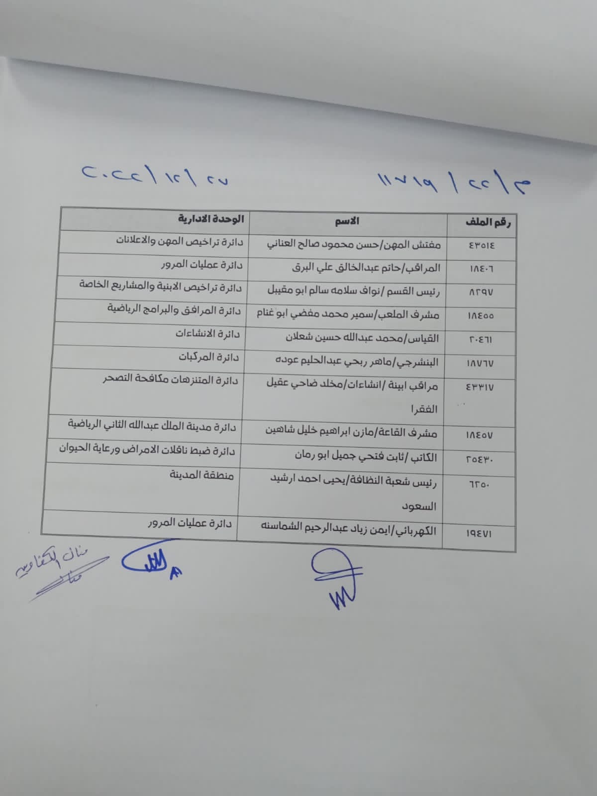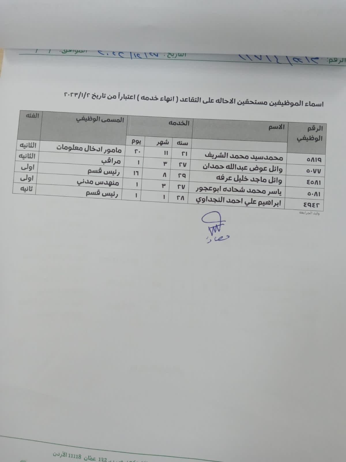 قرر أمين عمان الدكتور يوسف الشواربة الموافقة على احالة عدد من موظفي الأمانة إلى التقاعد.