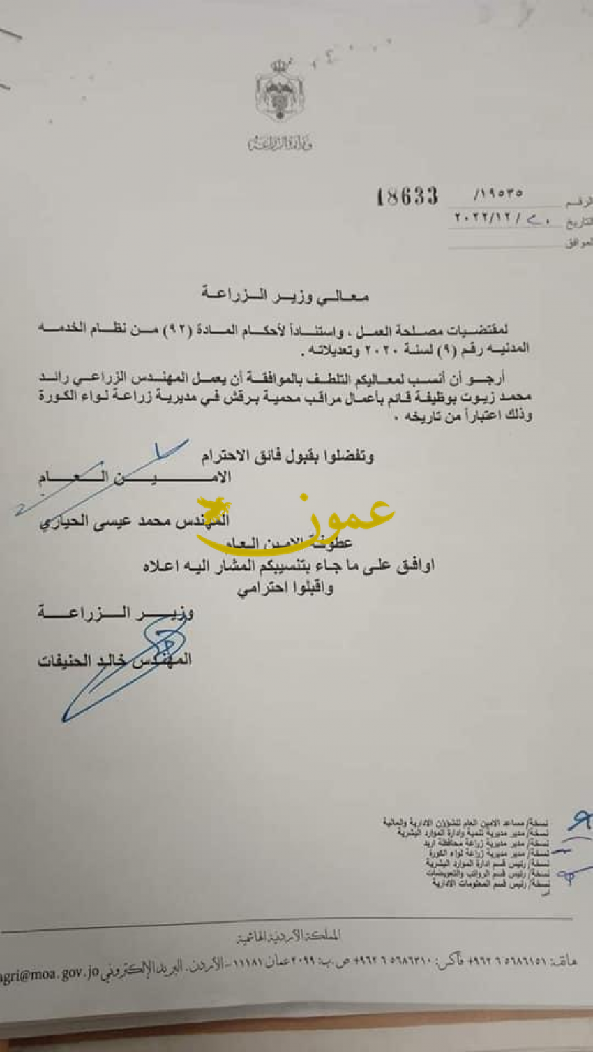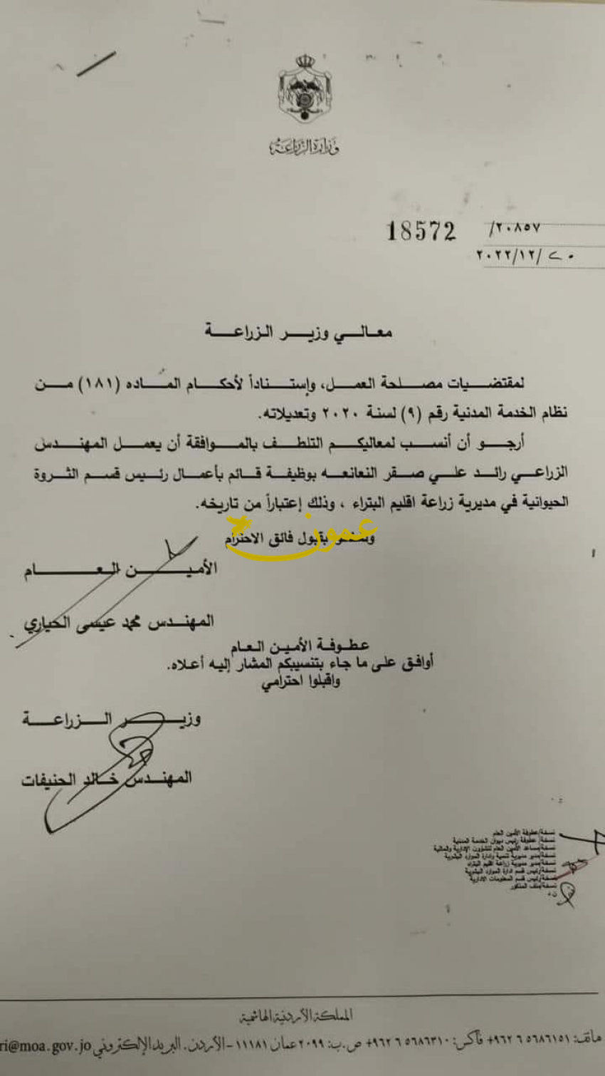 قرر وزير الزراعة المهندس خالد الحنيفات اجراء تشكيلات إدارية في مديريات الزراعة.