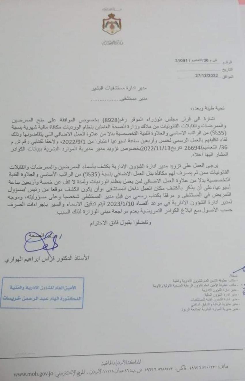 اوعز وزير الصحة الدكتور فراس الهواري لتزويد مدير ادارة الشؤون الادارية بكشف اسماء الممرضين والممرضات والقابلات القانونيات ممن لم يصرف لهم مكافأة بدل العمل الاضافي بنسبة 35% من الراتب الأساسي والعلاوة الفنية التخصصية بدلا من علاوة العمل الاضافي لمن يعمل بنظام الورديات ولمدة لا تقل عن خمسة وأربعين ساعة أسبوعيا في موعد أقصاه 10/1/2023.