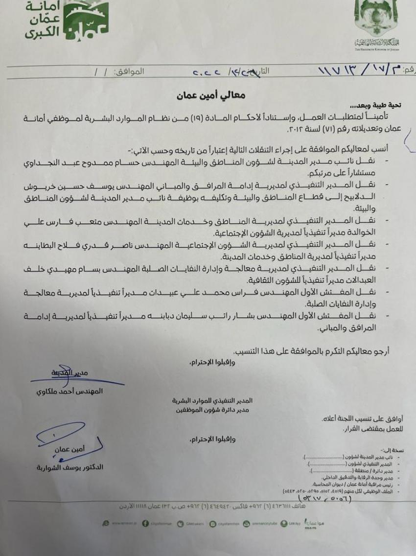 وافق أمين عمان الدكتور يوسف الشواربة على اجراء تنقلات إدارية بين مدراء المديريات في أمانة عمان الكبرى.