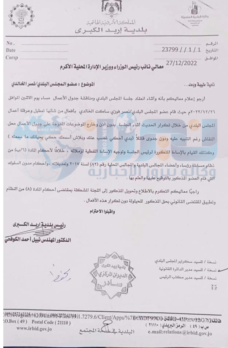 قال رئيس بلدية إربد الكبرى نبيل الكوفحي، إنه قام بتقديم شكوى بحق عضو المجلس البلدي نصر الخالدي بصفته الرسمية كرئيس بلدية إلى نائب رئيس الوزراء ووزير الإدارة المحلية توفيق كريشان.