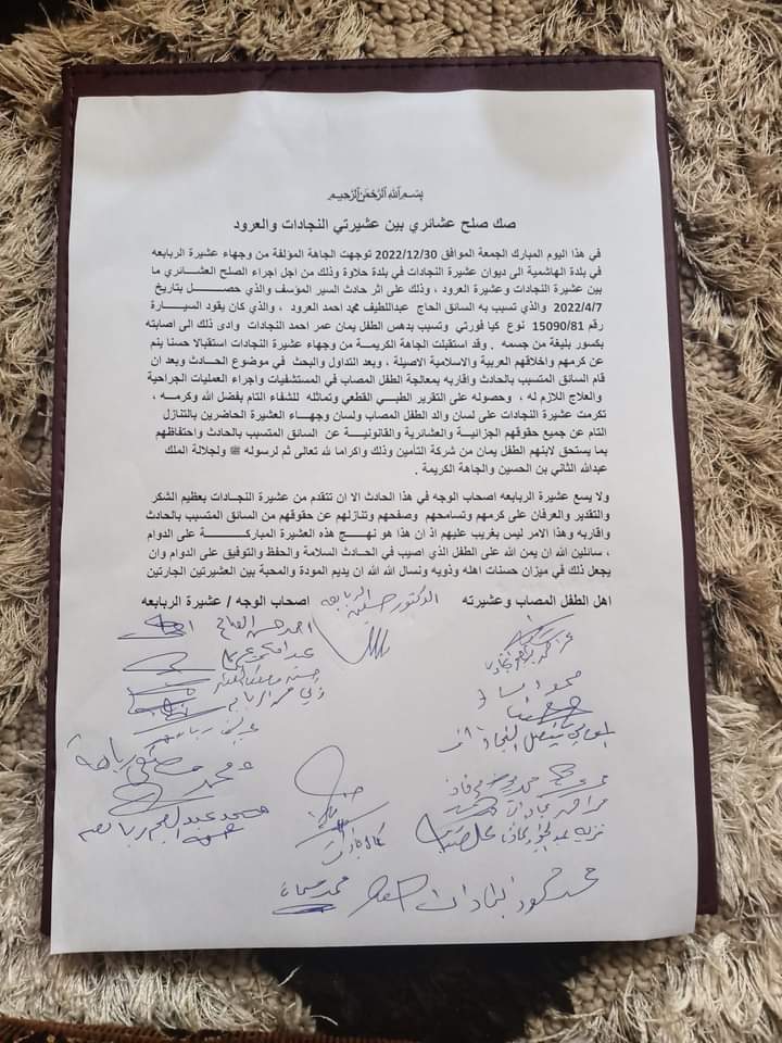 عشيرة الربابعه تجري صلحا عشائريا  بين عشيرتي النجادات والعرود على إثر حادث السير المؤسف الذي تعرض له الطفل يمان عمر احمد نجادات وتسبب به السائق الحاج عبداللطيف محمد احمد العرود وقد تماثل الطفل يمان  للشفاء التام وحصل على التقرير الطبي القطعي   .
