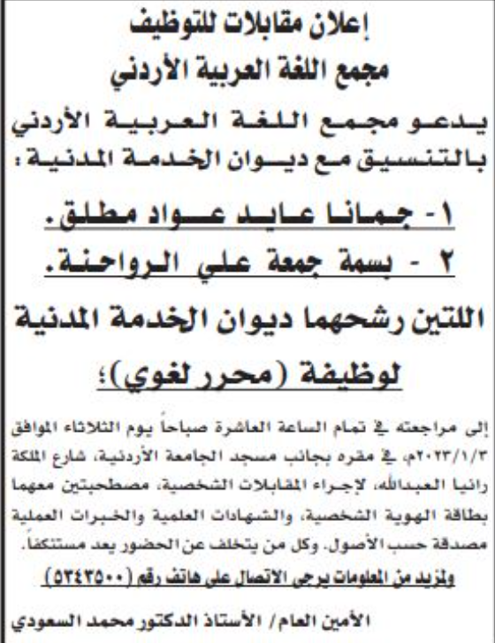 أعلنت عدد من المؤسسات الحكومية اليوم الإثنين، بالتنسيق مع ديوان الخدمة المدنية، عن حاجتها لتعيين وتعبيئة وظائف شاغرة وإجراء مقابلات شخصية.