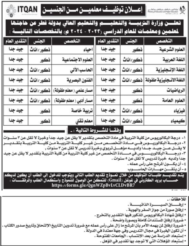 أعلنت وزارة التربية والتعليم القطرية عن حاجتها لتعيين معلمين بمختلف التخصصات.