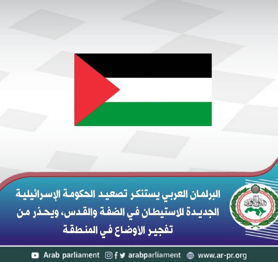 أدان البرلمان العربي، محاولات الحكومة الإسرائيلية الجديدة تصعيد الاستيطان في الضفة الغربية ومدينة القدس، معتبرا أن هذه الممارسات تمثل تحديا سافرا لقوانين المجتمع الدولي، محذرا من خطورة تداعيات هذه الممارسات الإسرائيلية والتي تنذر بالمزيد من موجات العنف، وتفجير الأوضاع في المنطقة.