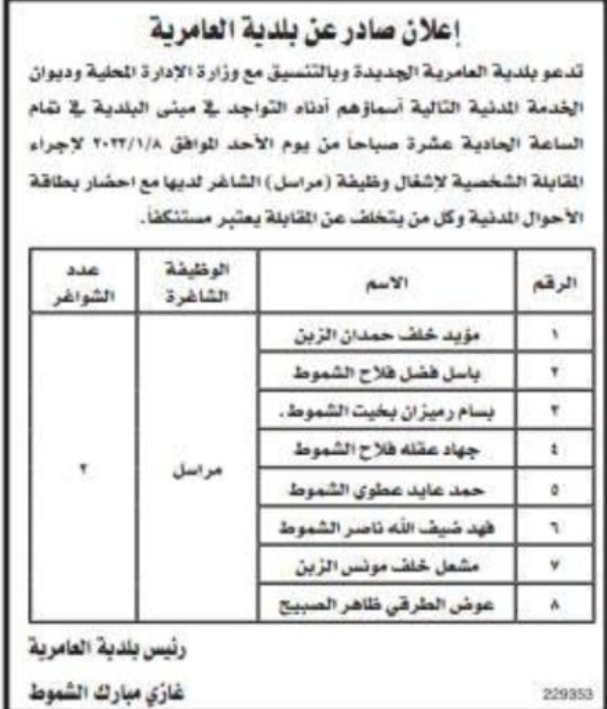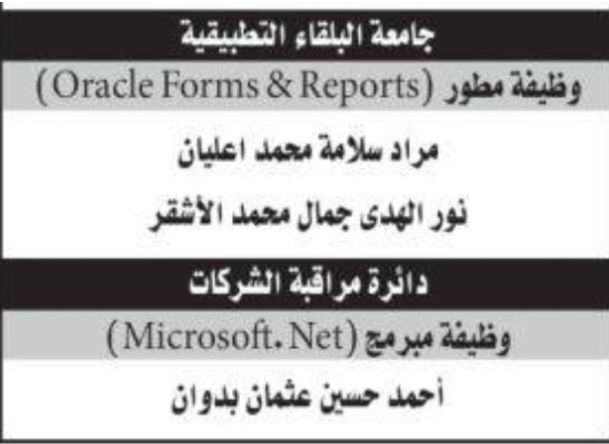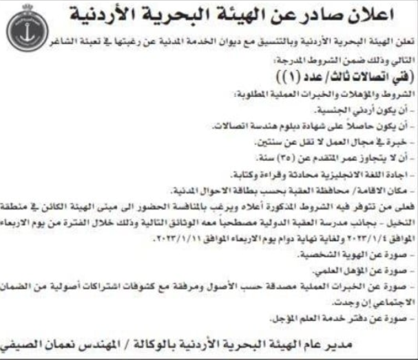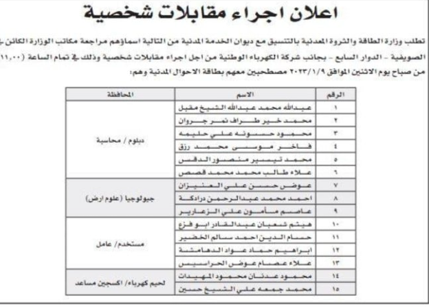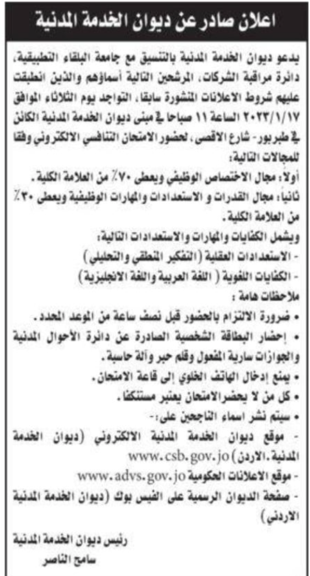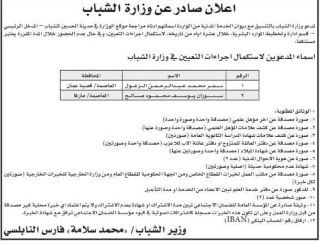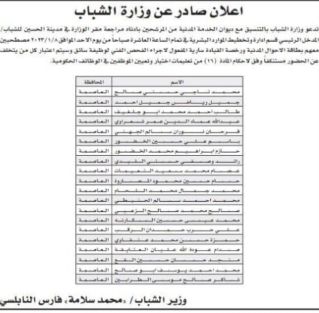 أعلنت عدد من الوزارات والمؤسسات الحكومية اليوم الثلاثاء، بالتنسيق مع ديوان الخدمة المدنية، عن حاجتها لتعيين وتعبيئة وظائف شاغرة وإجراء مقابلات شخصية.