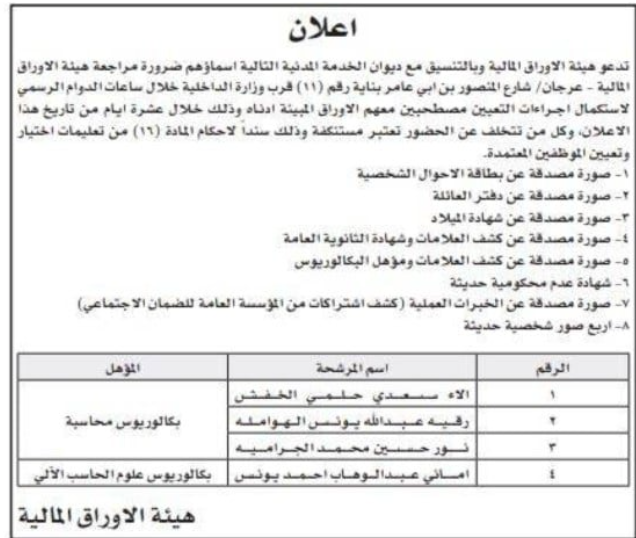 ودعت المؤسسات المدرجة أسماؤهم أدناه لاصطحاب الوثائق اللازمة للتعيين.
