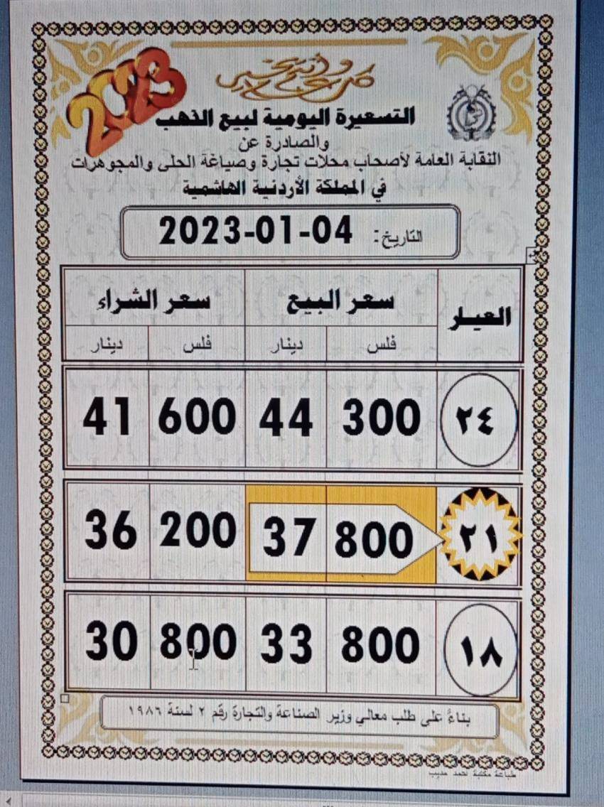 وبلغ سعر غرام الذهب عيار 21 اليوم عند 37.80 دينارا، لجهة الشراء من المحلات مقابل 36.20 دينارا لجهة البيع.