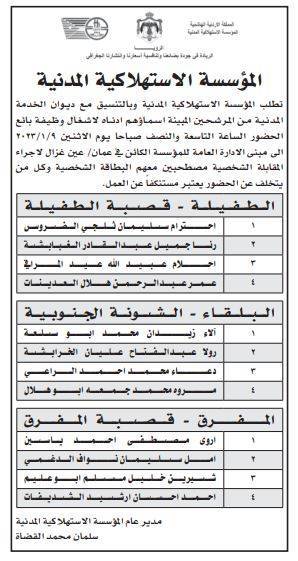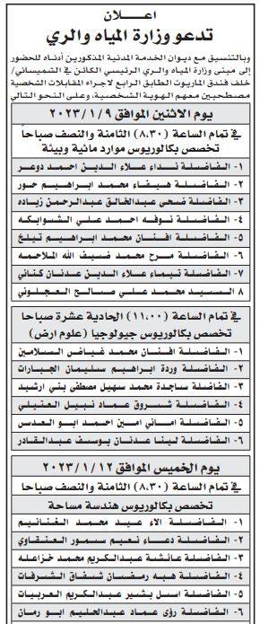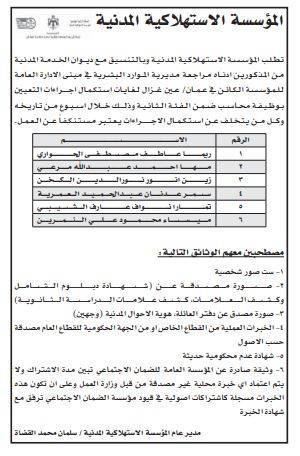 أعلنت عدد من الوزارات والمؤسسات الحكومية اليوم الثلاثاء، بالتنسيق مع ديوان الخدمة المدنية، عن حاجتها لتعيين وتعبيئة وظائف شاغرة وإجراء مقابلات شخصية.