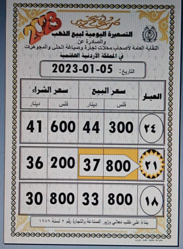 وبحسب التسعيرة اليومية الصادرة عن النقابة، بلغ سعر بيع الغرام الواحد من عيار 21 قيراط، الأكثر طلبا بين الأردنيين، عند 37.80 لغايات شراء المواطنين من محلات الصاغة.