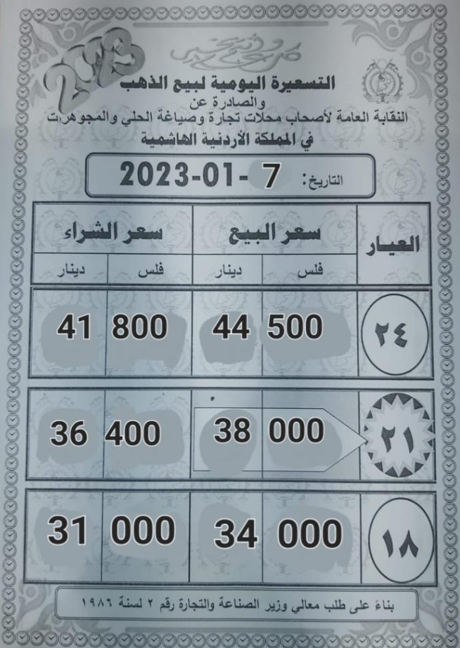 ووفقا للتسعيرة اليومية الصادرة عن النقابة، ارتفعت سعر بيع الغرام الواحد من عيار 21 قيراط، الأكثر طلبا بين الأردنيين، إلى 38 دينار، و36.4 دينار للشراء.