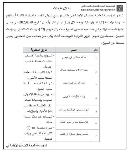 ودعت المؤسسات المدرجة أسماؤهم أدناه لاصطحاب الوثائق اللازمة للتعيين.