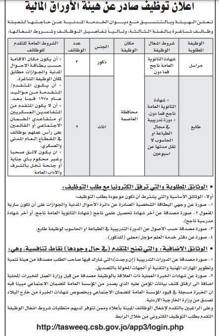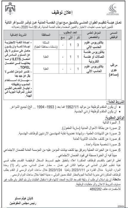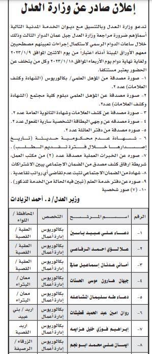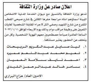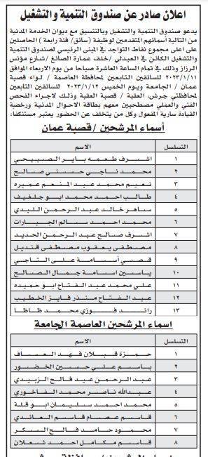 أعلنت عدد من الوزارات والمؤسسات الحكومية اليوم الأحد، بالتنسيق مع ديوان الخدمة المدنية، عن حاجتها لتعيين وتعبيئة وظائف شاغرة وإجراء مقابلات شخصية.