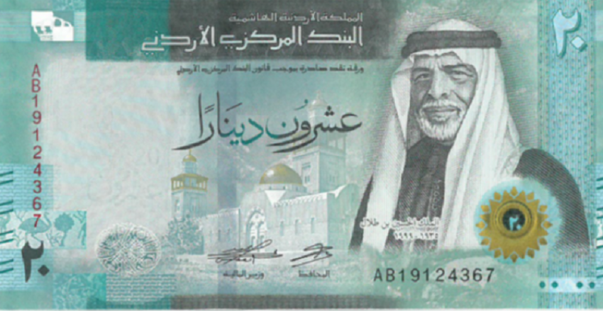 نشر البنك المركزي الأردني، مساء السبت، صور 4 فئات من أوراق النقد الأردني الصادرة في الإصدار الخامس، التي لن تحمل الصفة القانونية كعملة قابلة للتداول إلا بعد طرحها جنباً إلى جنب مع فئات الإصدار الحالي للأوراق النقدية.