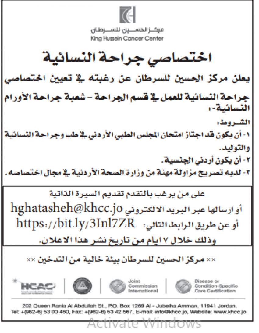 وظيفة شاغرة لدى مركز الحسين للسرطان