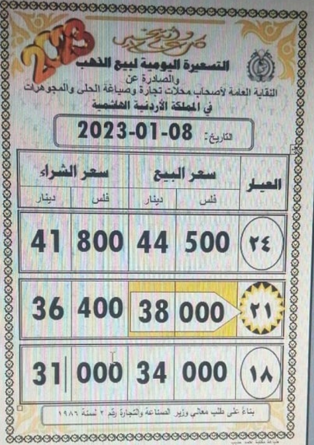 بلغ سعر الذهب من عيار 21 في السوق المحلي اليوم الأحد، 38 دينارا للغرام وفق التسعيرة اليومية الصادرة عن النقابة العامة لاصحاب محلات تجارة وصياغة الحلي والمجوهرات.