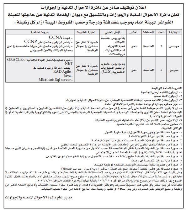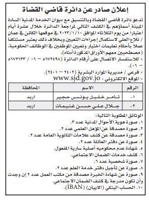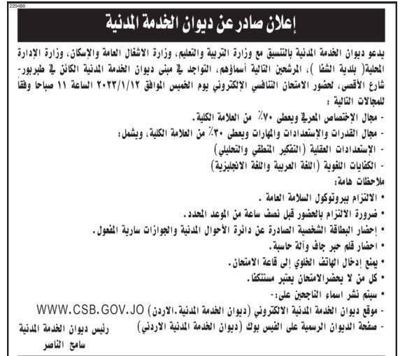 أعلنت عدد من الوزارات والمؤسسات الحكومية اليوم الإثنين، بالتنسيق مع ديوان الخدمة المدنية، عن حاجتها لتعيين وتعبيئة وظائف شاغرة وإجراء مقابلات شخصية.
