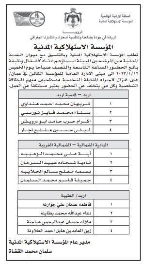 أعلنت عدد من المؤسسات الحكومية اليوم الثلاثاء، بالتنسيق مع ديوان الخدمة المدنية، عن حاجتها لتعيين وتعبيئة وظائف شاغرة وإجراء مقابلات شخصية.