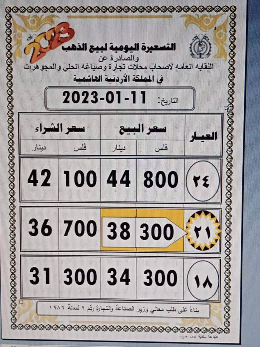 ووفق التسعيرة بلغ سعر غرام الذهب من عيار 21 وهو الأكثر رغبة لدى الأردنيين 38.30 دينارا لجهة الشراء من المحلات، و36.70 دينارا لجهة البيع.