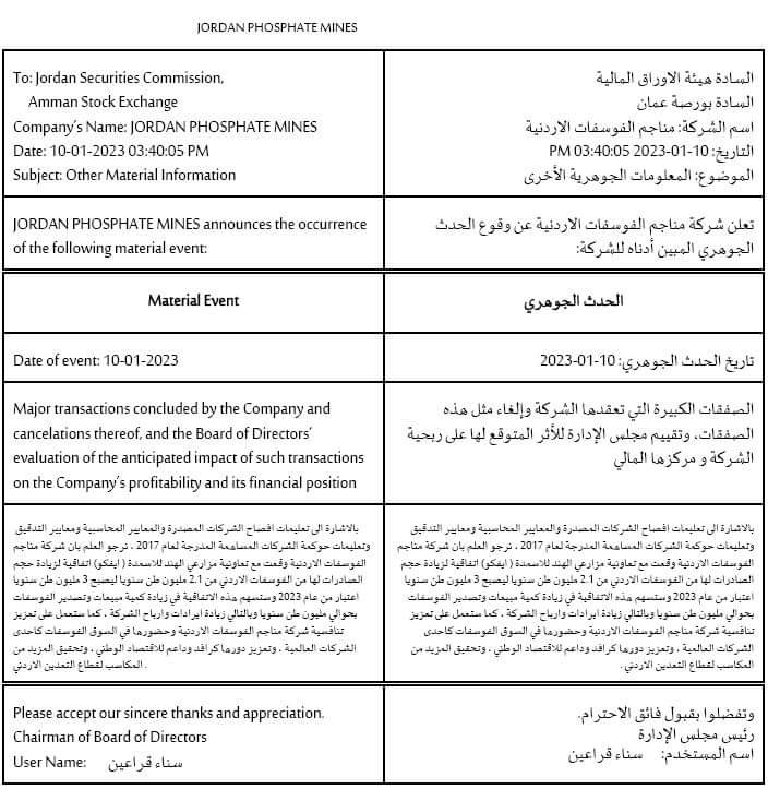 في ادراج لها على موقع هيئة الأوراق المالية وبورصة عمان، افصحت شركة مناجم الفوسفات الأردنية عن الاتفاقية التي ابرمتها مؤخرا مع مجموعة افكو الهندية (تعاونية مزارعي الهند) والتي نصت على زيادة حجم الصادرات بنحو 3 مليون طن سنويا بدلا من 2.1 مليون سنويا.