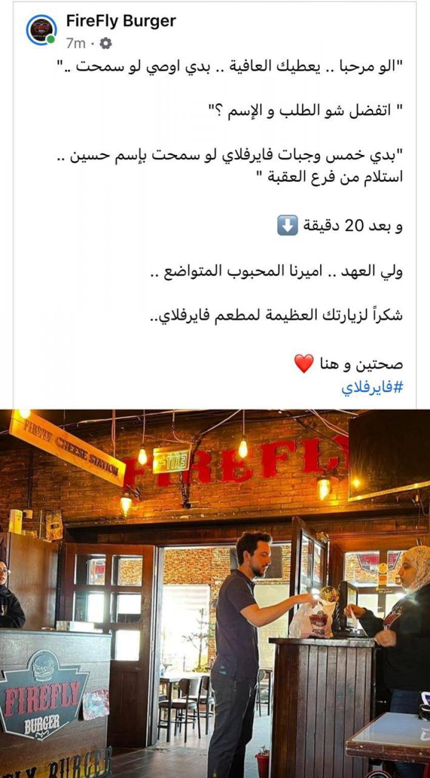 فاجئ سمو ولي العهد الأمير الحسين، مطعما اليوم الخميس، بطلب "خمس وجبات فايرفلاي "
