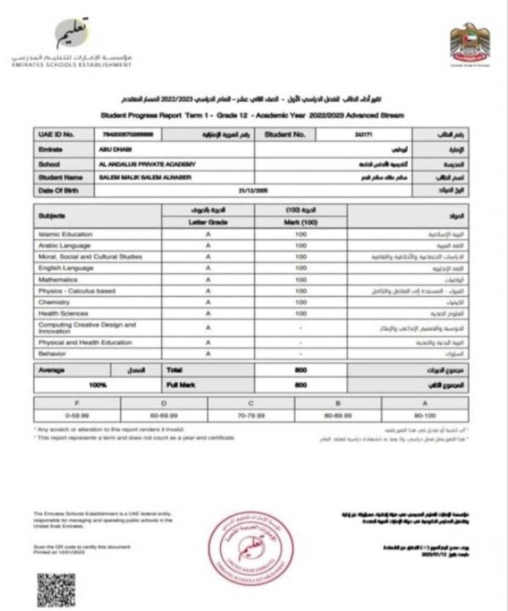 حقق الشاب الأردني سالم مالك سالم مهيدي النصر بني حميدة تفوقا باهرا في شهادة الثانوية في دولة الامارت في الفرع العلمي للفصل الأول وحصل على المركز الأول على مستوى الدولة وبمعدل (100%).