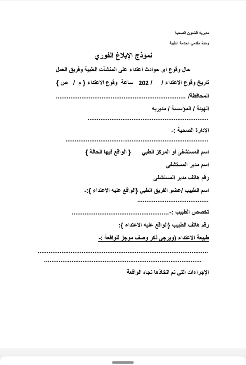 ٢- يذكر بالمذكرة الإدارية أسماء الفريق الطبي المعتدي عليه و أسماء الشهود وكذلك بيان بالتلفيات .