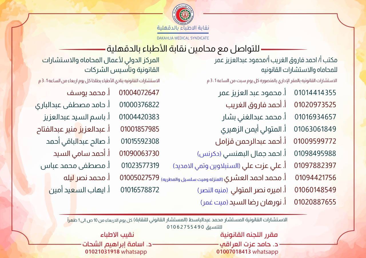 ٦ - أسماء الفريق القانوني واللجنة القانونية بنقابة الأطباء بالدقهلية مصحوبه بأرقام التواصل  تم إرسالها إلي قيادات المنظومة الصحيه بالدقهلية  و منشورة علي الجروب والصفحة الرسمية لنقابة الأطباء بالدقهلية.
