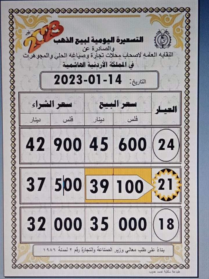 وبلغ سعر الذهب عيار 21 الأكثر طلبا من قبل الأردنيين، اليوم الجمعة، 39.1 دينارا لجهة الشراء من المحلات و37.5 دينارا لجهة البيع.