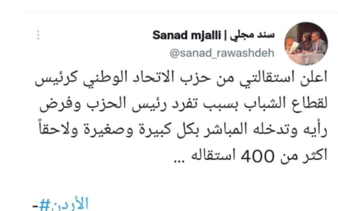 أعلن رئيس القطاع الشبابي في حزب الاتحاد الوطني سند مجلي الرواشدة عن استقالته من الحزب عبر حسابه الرسمي في منصة تويتر بسبب تفرد الأمين العام للحزب باتخاذ القرارات بما يتعلق بكافة شؤون الحزب.