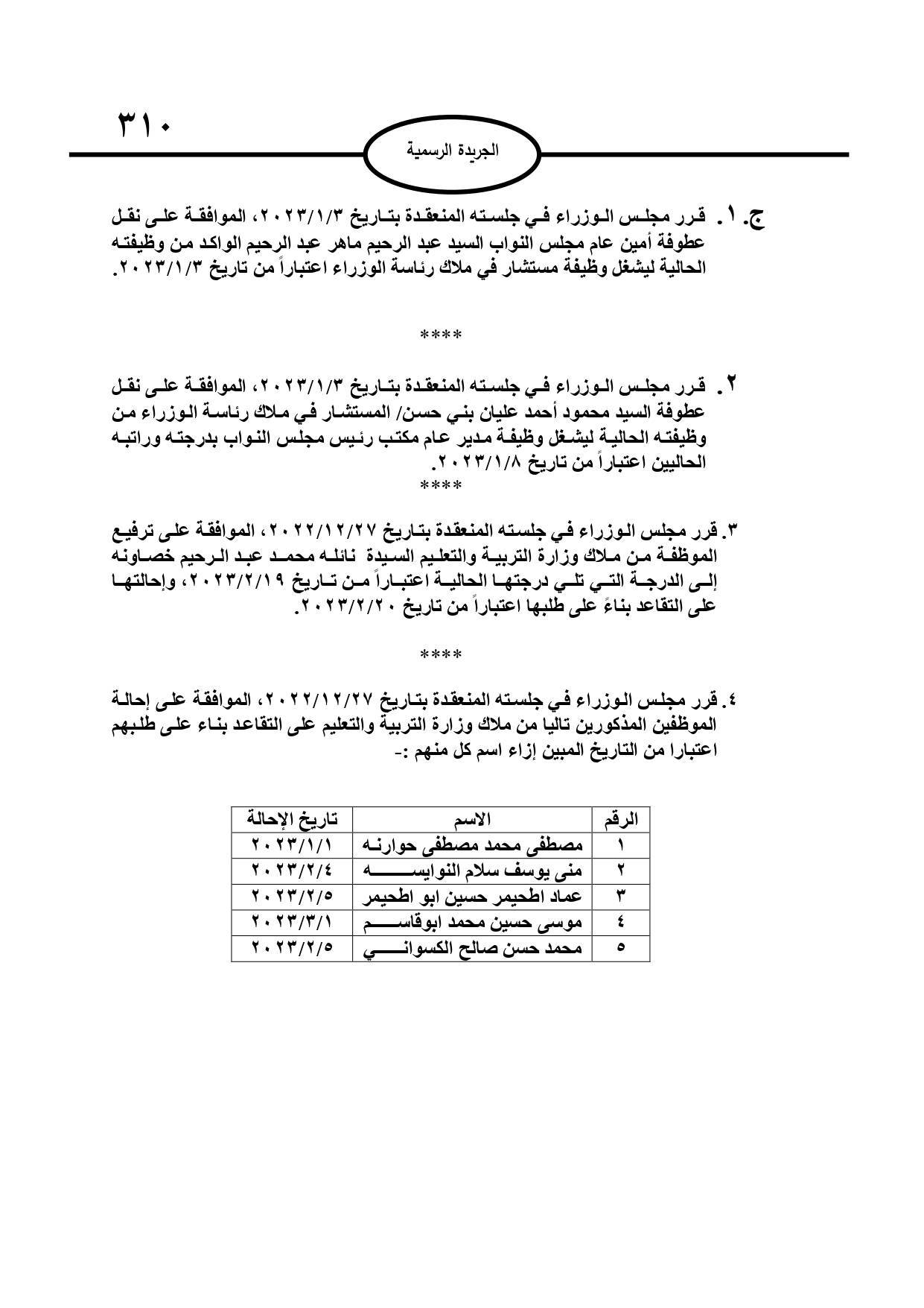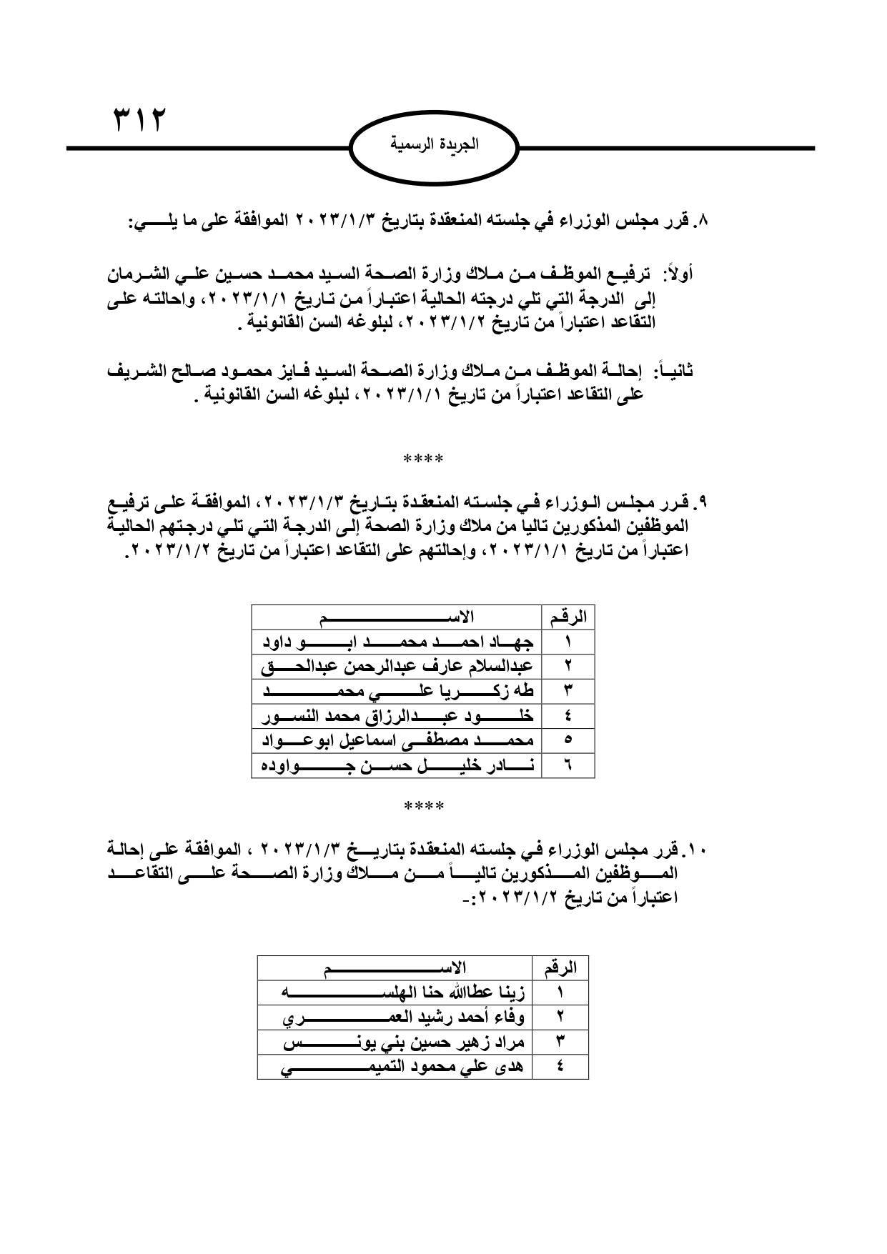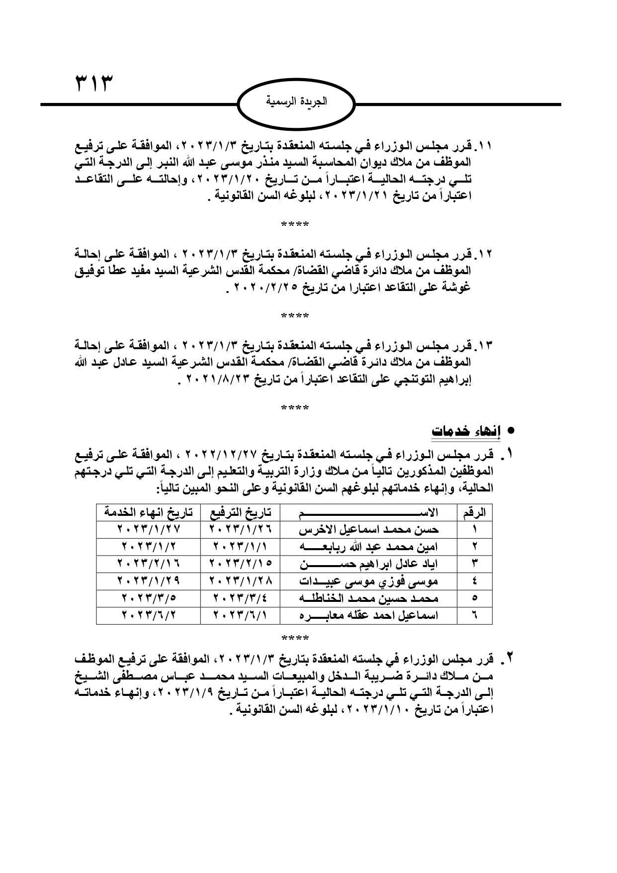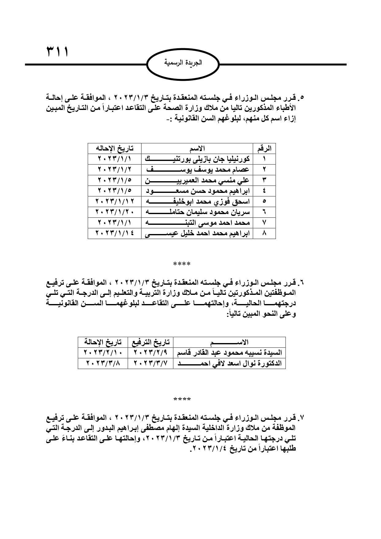 وبحسب الجريدة الرسمية الصادرة عن الحكومة، الخميس، قرر مجلس الوزراء إحالة عدد من الموظفين إلى التقاعد، وإنهاء خدمات آخرين.