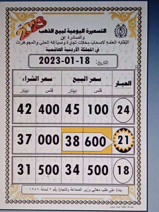 وبلغ سعر بيع غرام الذهب عيار 21 الأكثر رغبة من الأردنيين بالسوق المحلية عند 38,60 دينارا لغايات شراء المواطنين من محلات الصاغة.
