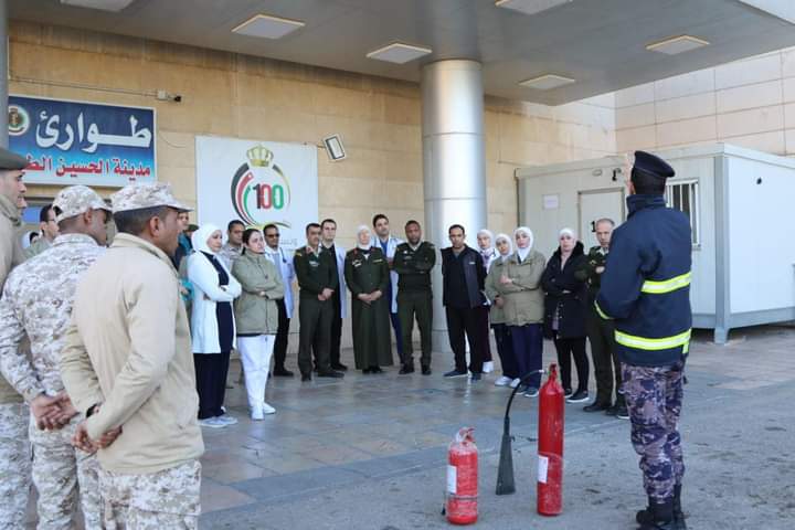 نفذ طوارئ مدينة الحسين الطبية بالتعاون مع مديرية الدفاع المدني غرب عمان تمريناً وهمي مفترض داخل المركز.