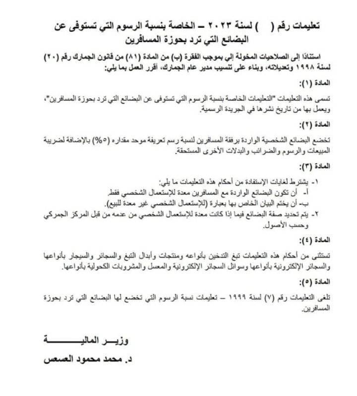 مسودة التعليمات، فأن البضائع الشخصية الواردة برفقة المسافرين تخضع لنسبة رسم تعريفة موحدة مقدارها 5% بالإضافة إلى لضريبة المبيعات والرسوم والضرائب والبدلات الأخرى المستحقة.