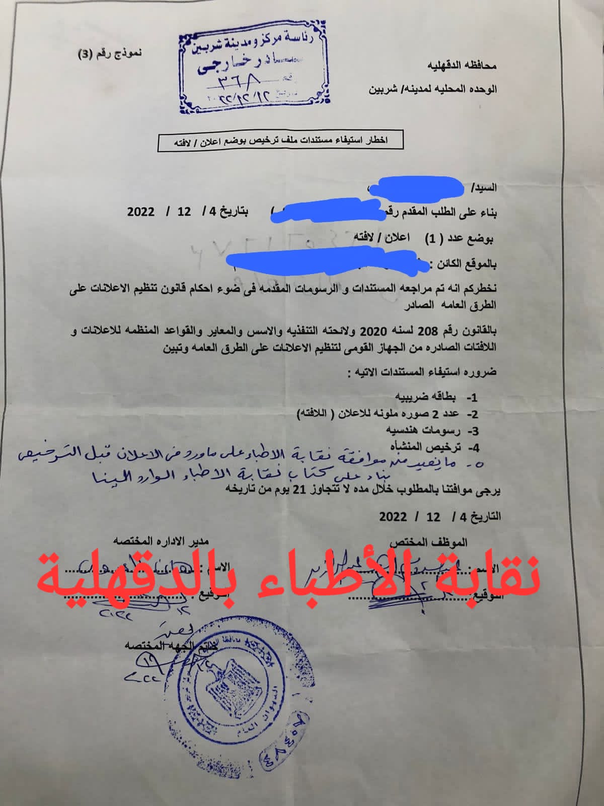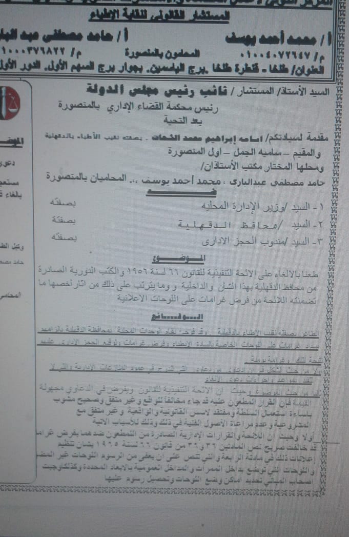 وتهيب نقابة الأطباء بالدقهلية بكافة الزملاء بالتواصل مع مجلس النقابة أو الفريق القانونى فى حالة أى عدوان على حقوق الأطباء فى الدعاية الخاصة بهم حال الإلتزام بالقانون.