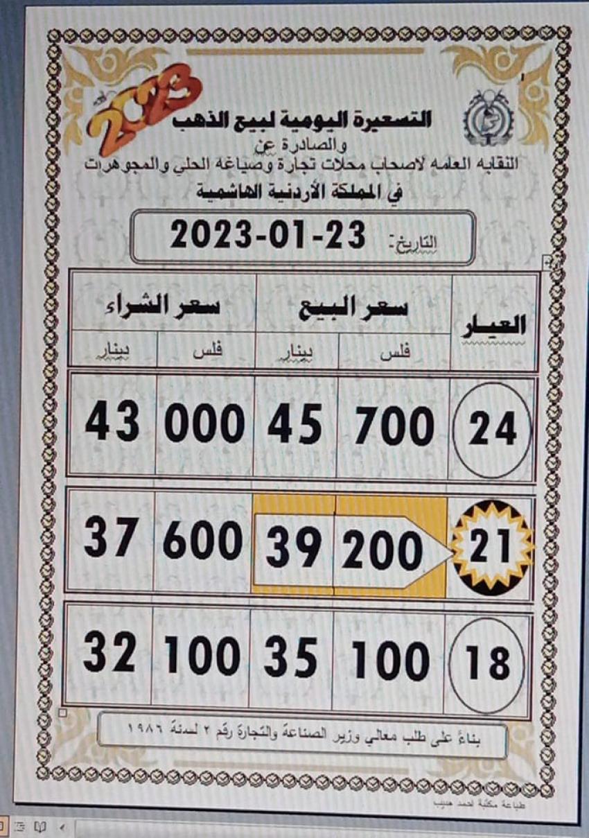 وبلغ سعر بيع غرام الذهب عيار 21 الأكثر رغبة من الأردنيين بالسوق المحلية عند 39.20 دينار لغايات شراء المواطنين و 37.60 لغايات البيع لمحلات الصاغة.