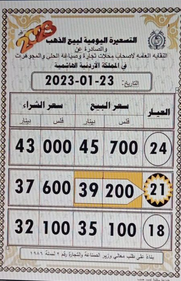 وبلغ سعر بيع غرام الذهب عيار 21 الأكثر رغبة من الأردنيين بالسوق المحلية عند 39,20 دينارا لغايات شراء المواطنين من محلات الصاغة.