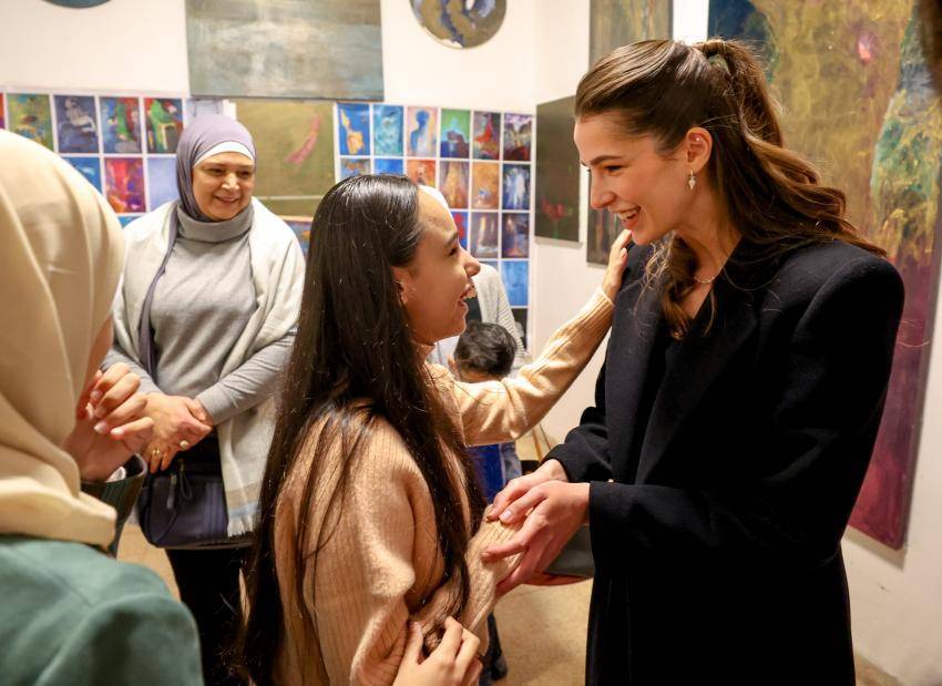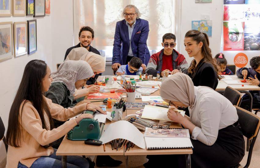 واطلع سمو الأمير والآنسة رجوة على أعمال الطلبة الإبداعية، خلال ورشة عمل بدارة الفنان التشكيلي سهيل البقاعين في جبل اللويبدة في العاصمة عمان.