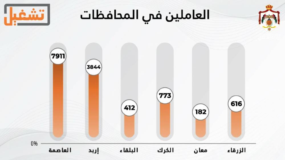 ووفق الرسومات التوضيحية المنشورة عبر صفحة الوزارة، الخميس، فإن عدد العاملين توزع على المحافظات كما يلي: العاصمة 7911، وإربد 3844، والبلقاء 412، والكرك 773، ومعان 182، والزرقاء 616.