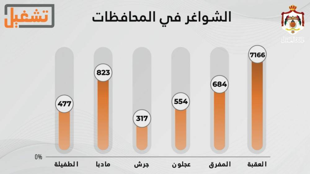 فيما بلغت الشواغر في المحافظات كالآتي: العقبة 7166، المفرق 684، عجلون 554، جرش 317، مادبا 823، الطفيلة 477.