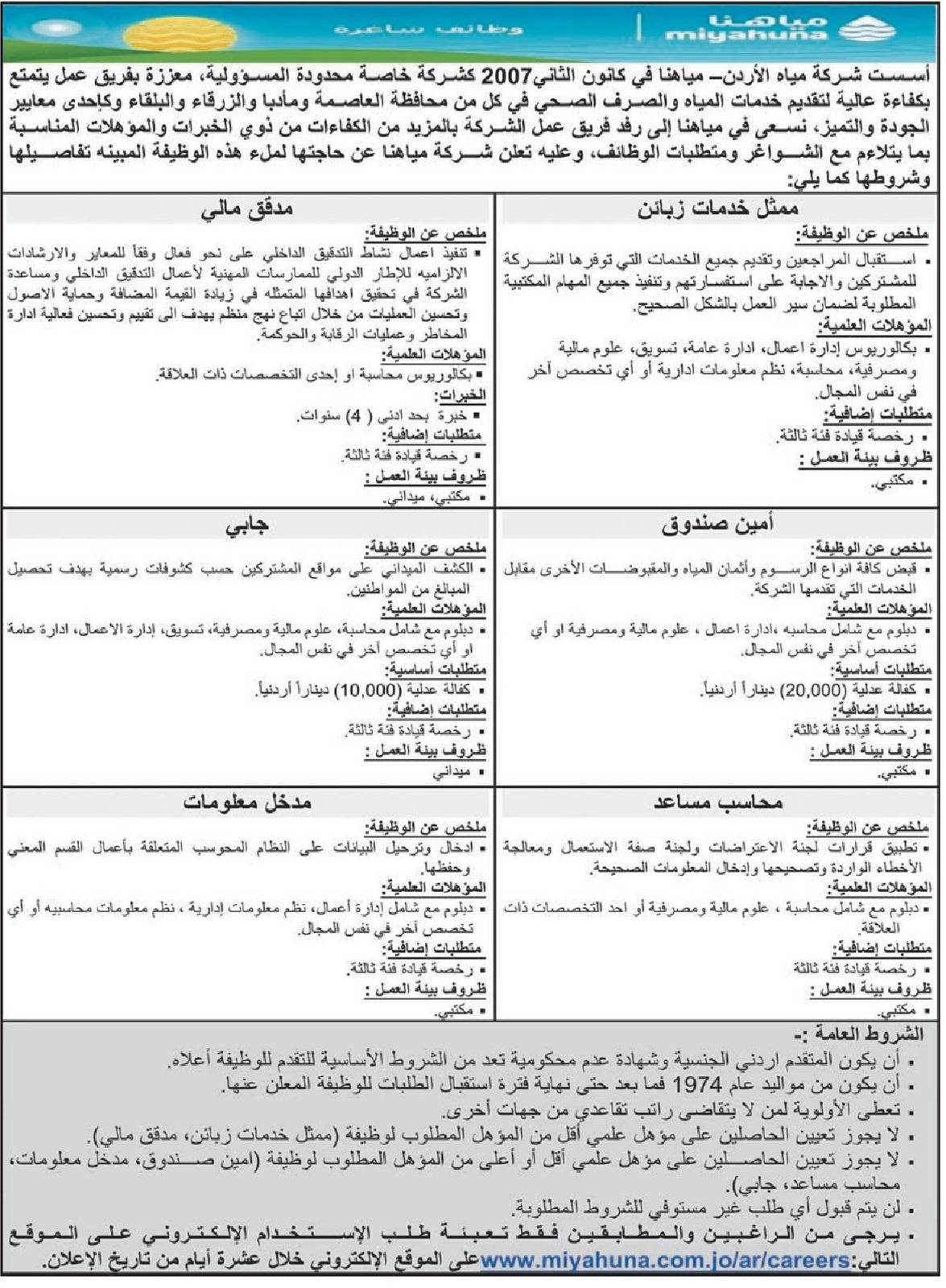 أعلنت شركة مياه الأردن (مياهنا)، عن حاجتها إلى تعيين عدد من الموظفين (ممثل خدمات زبائن، مدقق مالي، أمين صندوق، جابي، محاسب مساعد، مدخل معلومات).