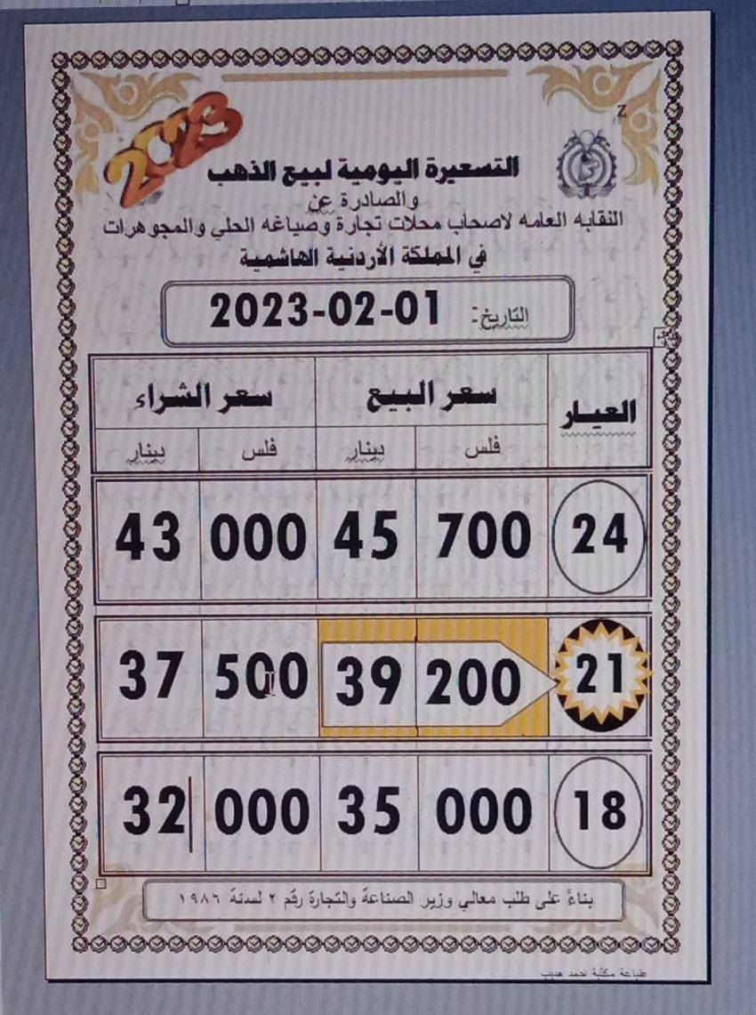 وبلغ سعر الذهب عيار 21 الأكثر طلبا من قبل الأردنيين 39.20 دينارا لجهة الشراء من المحلات و 37.30 دينارا لجهة البيع.