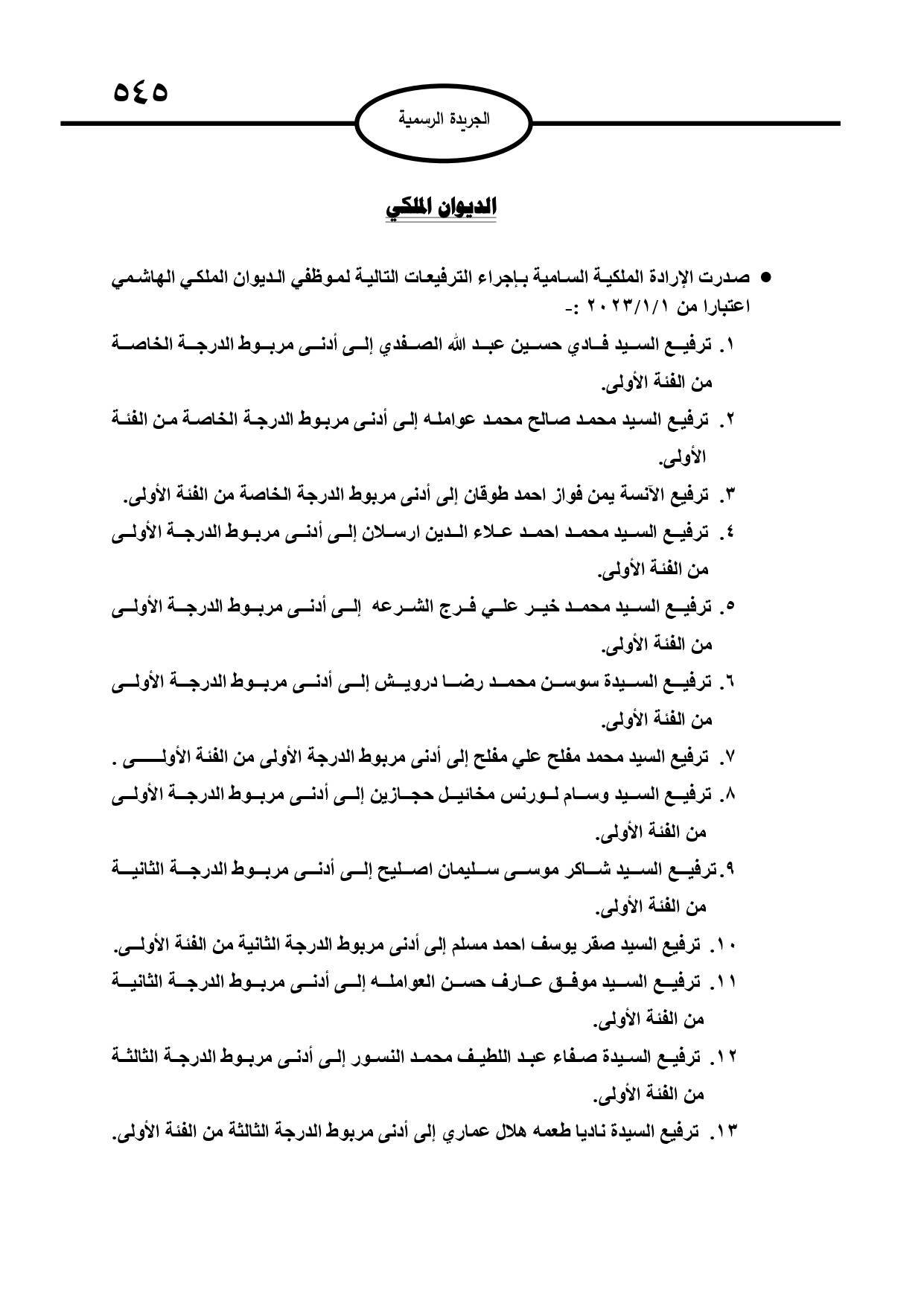 صدرت الإرادة الملكية السامية بإجراء ترفيعات لعدد من موظفي الديوان الملكي الهاشمي اعتبارا من الأول من كانون الثاني الماضي.