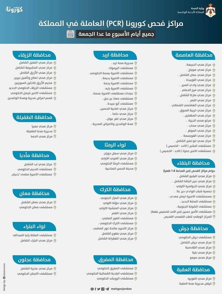 مراكز فحص كورونا (PCR) العاملة في المملكة ,جميع ايام الاسبوع ما عدا الجمعة حسب التالي: