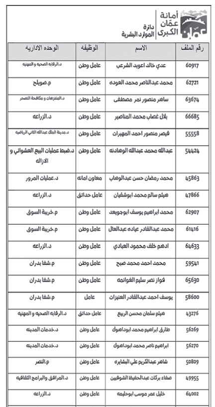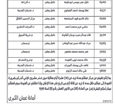 أنذرت أمانة عمان الكبرى، اليوم الاحد، 29 عامل وطن وعامل حدائق آخر، بالعودة إلى عملهم خلال 3 أيام، وإلا سيتم فصلهم نتيجة تغيبهم عن العمل لمدة تزيد عن 10 أيام.