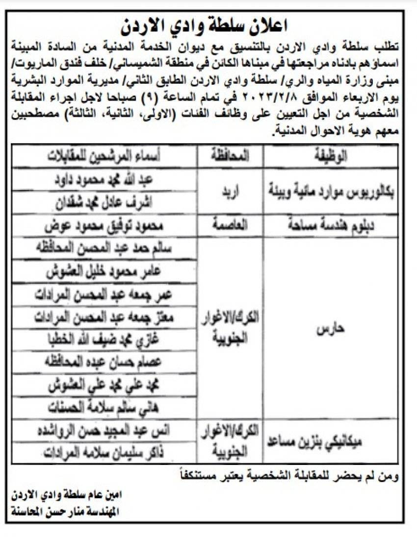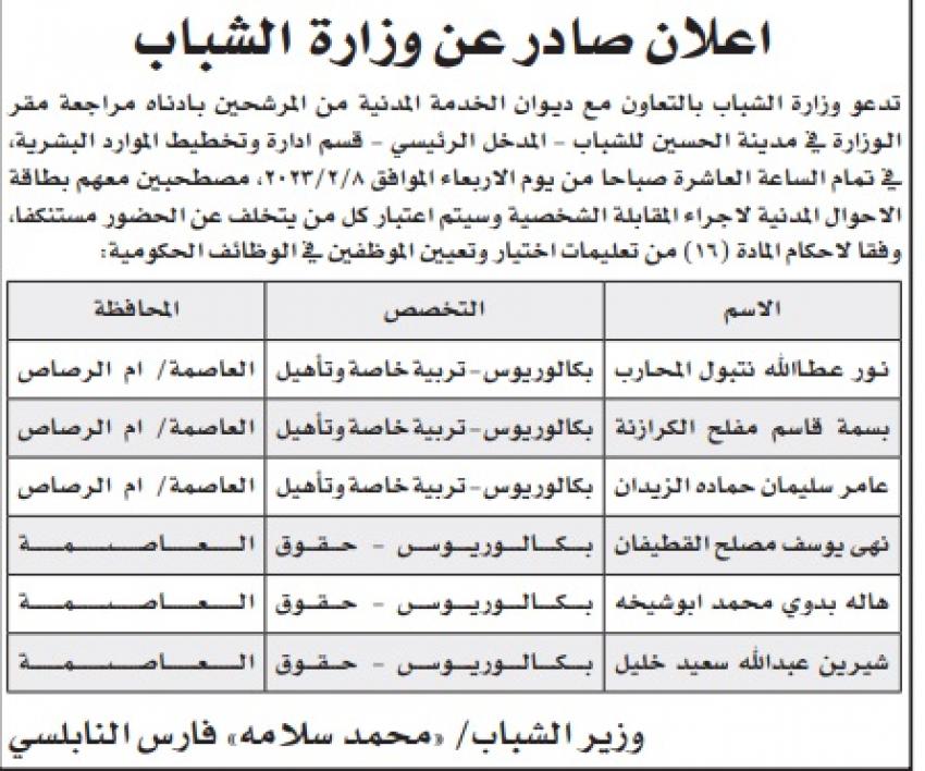 دعا ديوان الخدمة المدنية بالتنسيق مع عدد من الوزارات والمؤسسات الحكومية الأشخاص التالية لإجراء المقابلات الشخصية والامتحان التنافسي .